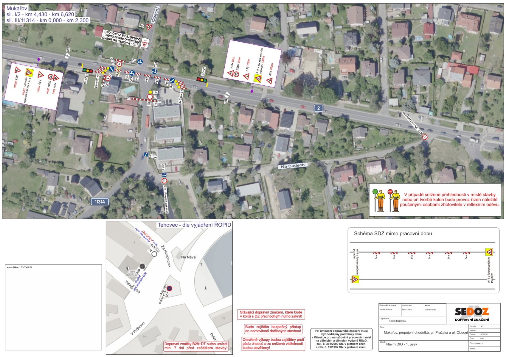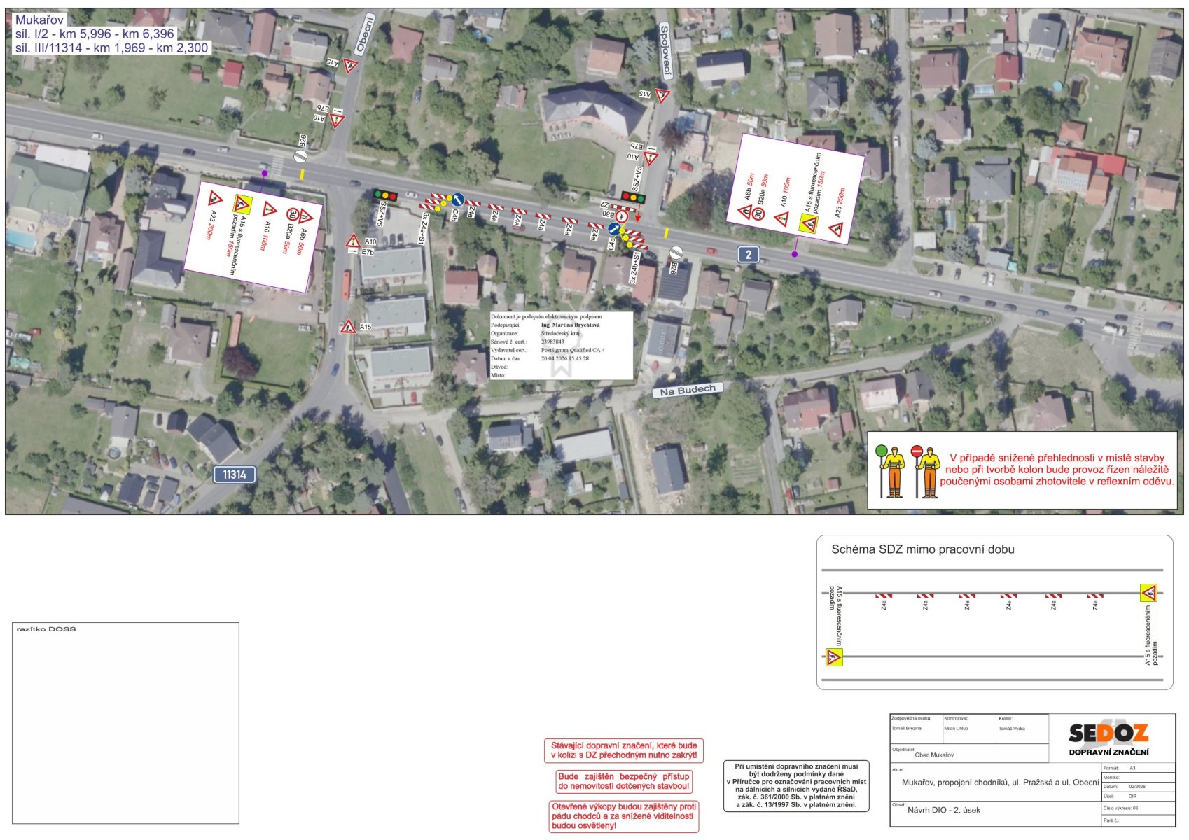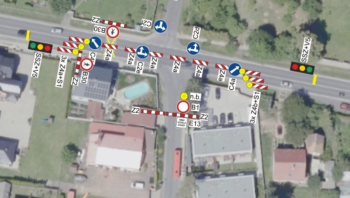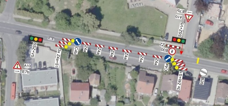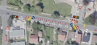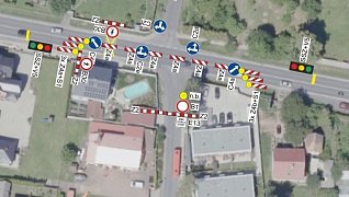 - doprava bude řízena poučenými pracovníky zhotovitele (regulovčíky) v ostatních časech pracovní doby bude řízení dopravy zajištěno světelným signalizačním zařízením. Mimo pracovní dobu bude přechodné dopravní značení odstraněno a provoz bude veden jako obousměrný bez omezení.