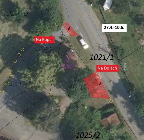 ve dnech 27.4. - 10.6.2026 bude v ulici Na Dolách probíhat výstavba napojovacího vodovodního potrubí pro novou tlakovací stanici. Omezení dopravy se týká místa napojení ulic Na Dolách a Na Kopci. V závislosti na postupu stavby bude napojení ulic Na Kopci z ulice Na Dolách vyznačeno buď ve své původní trase (A), nebo náhradní trasou nad trafostanicí (B).