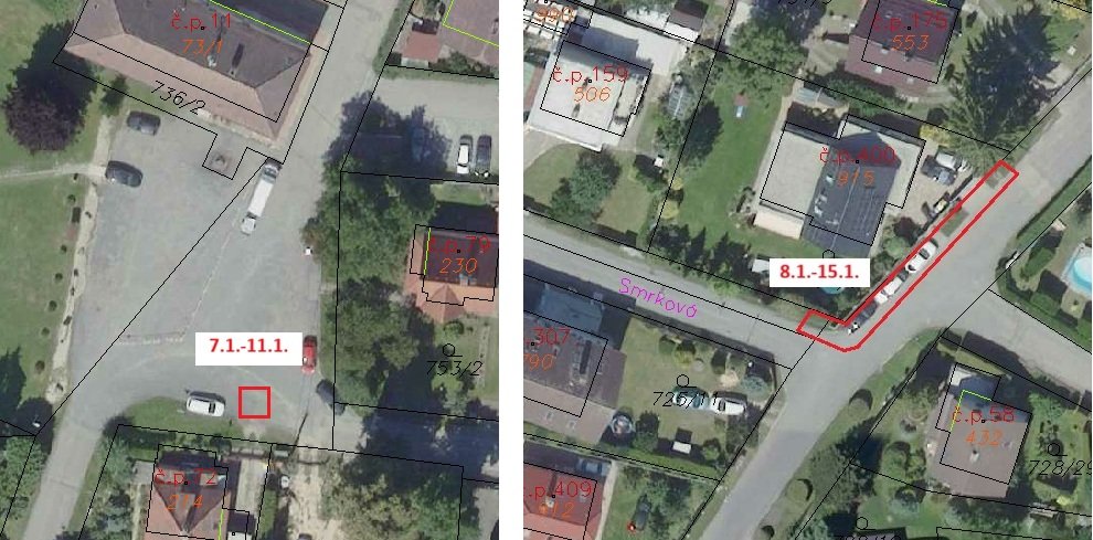 oznamujeme, že ve dnech 7.-15.1.2026 budou probíhat opravy dešťové kanalizace v ulicích Sportovní u čp 72 a na rohu Obecní a Smrkové u čp 400. Dobu provádění a rozsah stavby červeně viz zákresy: