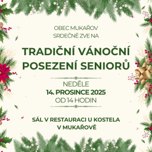 Srdečně vás zveme na předvánoční posezení seniorů, které se uskuteční 14. prosince 2025 od 14:00 v sále restaurace U Kostela v Mukařově. Těšit se můžete na milé vystoupení žáků ZŠ Mukařov, oblíbenou hru Bingo, k poslechu i tanci vám zahraje Duo Amoroso a nebude chybět ani příjemné občerstvení.