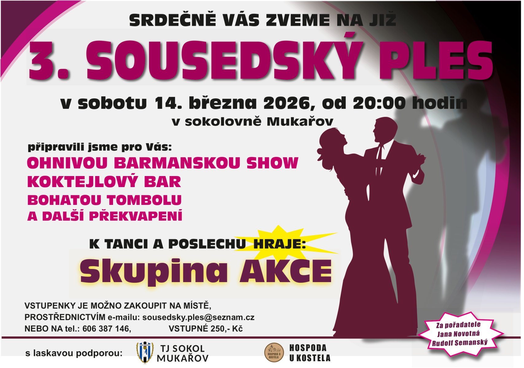 Srdečně vás zveme na 3. sousedský ples, který se uskuteční v sobotu 14. března 2026 od 20:00 hodin v sokolovně Mukařov.