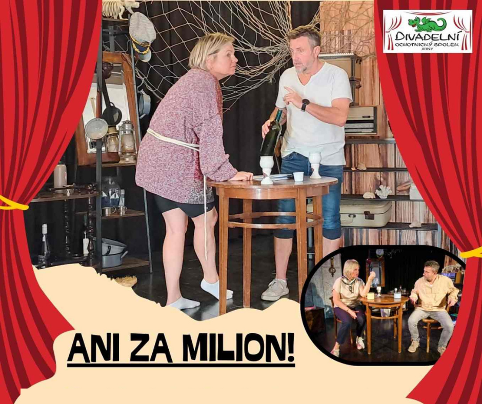 Divadelní ochotnický spolek Jirny srdečně zve na divadelní představení „Ani za milion!“, detektivní komedii z prostředí francouzského majáku, která divákům nabídne napětí, humor i nečekané zvraty.
