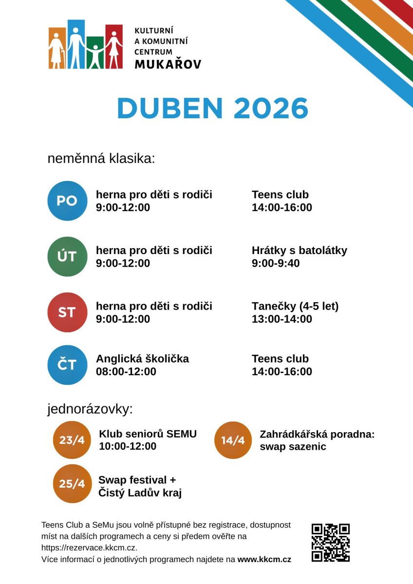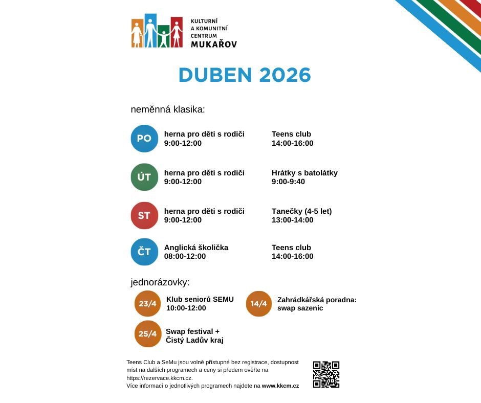 Dubnový program Kulturního a komunitního centra Mukařov navazuje na osvědčené aktivity, které si našly své pravidelné návštěvníky. V průběhu týdne jsou připraveny zejména programy pro rodiče s dětmi, ale také pro starší děti a mládež.