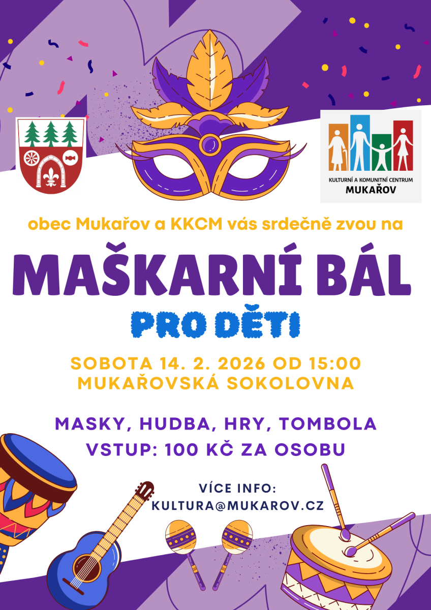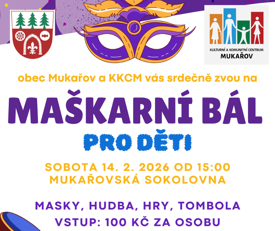 Obec Mukařov ve spolupráci s Kulturním a komunitním centrem Mukařov srdečně zve všechny děti i jejich doprovod na Maškarní bál pro děti, který se uskuteční v sobotu 14. února 2026 od 15:00 v sokolovně v Mukařově.