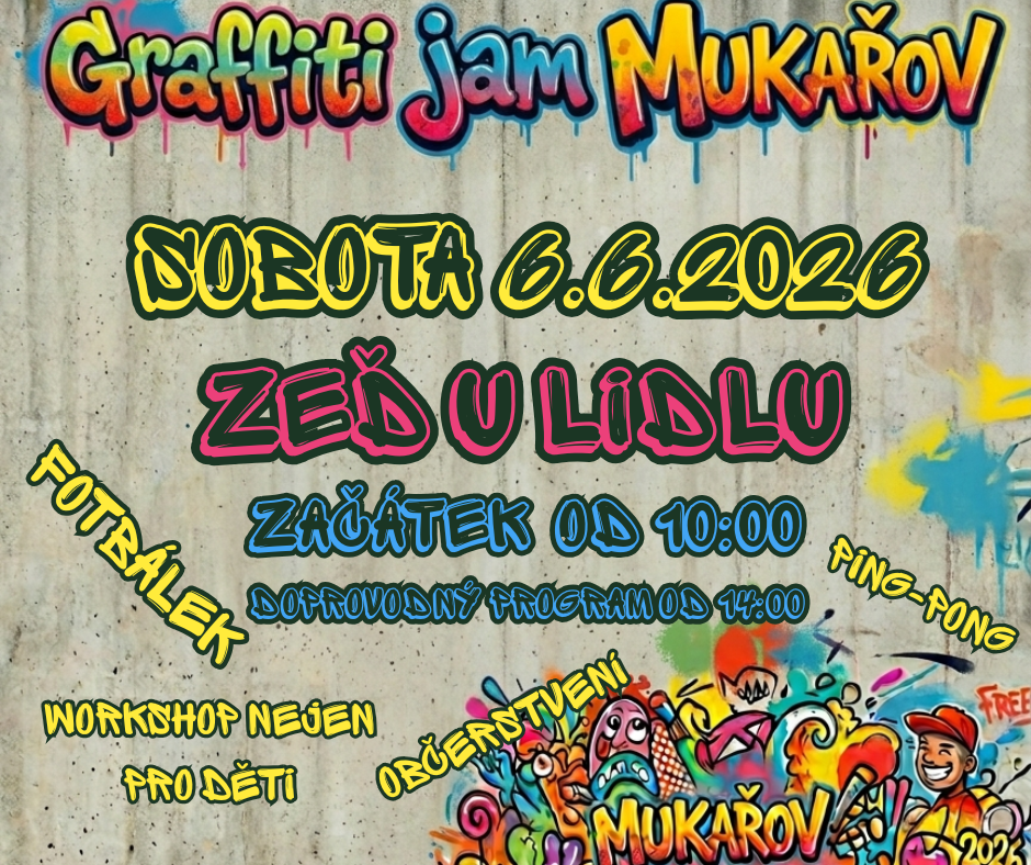 Zveme vás na jedinečnou uměleckou akci Graffiti Jam Mukařov, která se uskuteční 6. června na zdi u Lidlu. Během dne se tato plocha promění v originální galerii pod širým nebem, kde budete moci sledovat vznik street artu v přímém přenosu.