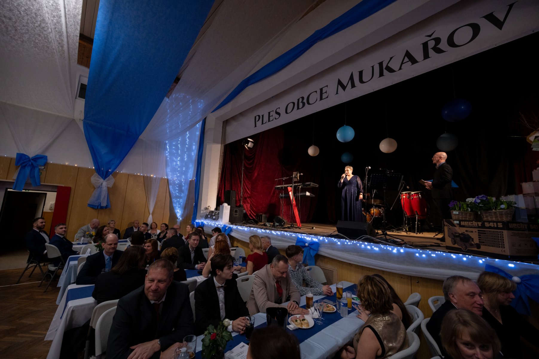 V sobotu 17. ledna se sokolovna v Mukařově proměnila v krásné „ledové království“. Originální výzdobu v modro-stříbrno-bílé barevné kombinaci připravili pan František Polesný a Miroslav Veselý, vedoucí technických služeb, společně s dalšími pracovníky technických služeb, kterým patří velké poděkování za jejich nápady a šikovnost. Do příprav se tradičně zapojily také Kateřina Čadilová a Dana Gaždová. Poděkování náleží rovněž starostce obce Haně Zákoucké za výraznou podporu a pomoc při organizaci této slavnostní události.
