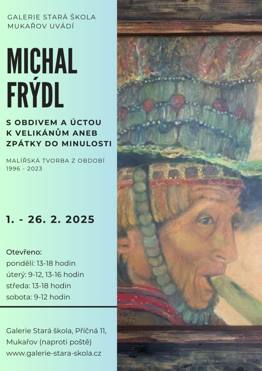 Galerie Stará škola srdečně zve na novou výstavu v naší galerii pod názvem: S obdivem a úctou k velikánům aneb zpátky do minulosti. Vystavovat zde bude vlastní tvorbu z období 1996-2023 Michal Frýdl, který bydlí v Srbíně a také provozuje oblíbené Bravo Bistro v Mukařově.